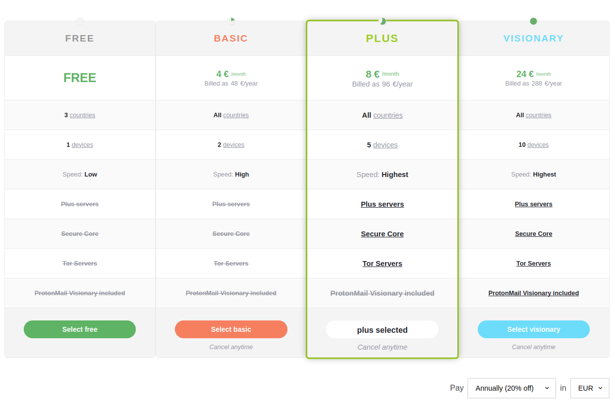 Einige Server spart ProtonVPN für Kunden mit höheren Tarifen Plus und Visionary – der zweite von ihnen bietet neben ProtonVPN auch den Dienst Protonmail an. Die teureren Tarife können auch die Funktion Secure Core nutzen, die die private Verbindung auch in dem Fall sicherstellen soll, dass der Server ProtonVPN in dem eigenen Land überwacht ist. Die Daten der Secure Code Nutzer werden über mehrere VPN Server übertragen, wodurch das Risiko, dass die IP-Adresse und Lokation identifiziert werden, deutlich geringer ist.